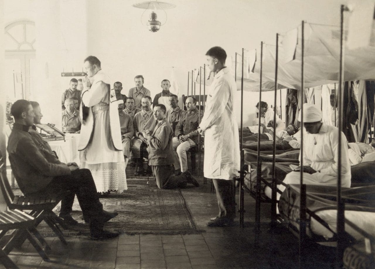 Joinain muina viikkoina asiat ovat paremmin ja tuo 24-vuotias sotamies pääsee ripittäytymään ja sotilaspappi tulee vierailemaan joukkueen luona ja jakaa miehille ehtoollista. Kalenteriinsa ja päiväkirjaansa sotamies piirtää vähän erilaisia ristejä sen mukaan, onko päässyt ripittäytymään, onko saanut nauttia ehtoollista vai onko joutunut vain muistelemaan messun liturgian mielessään. Harvinaisin merkintä sotapäiväkirjassa on niiden sunnuntaiden kohdalla, joina hän on päässyt osallistumaan jumalanpalvelukseen ranskalaisessa kyläkirkossa jossain länsirintaman suunnalla.